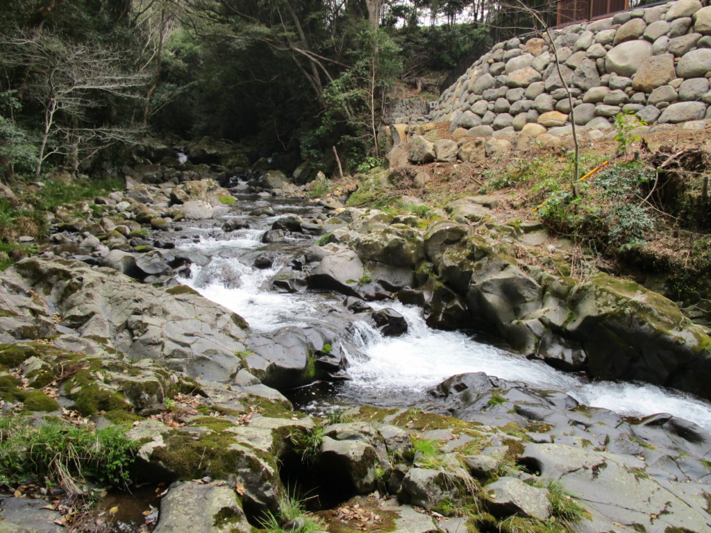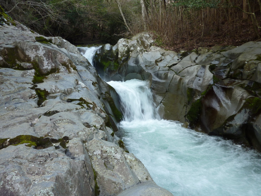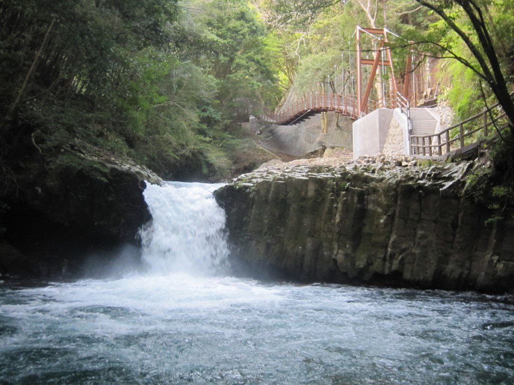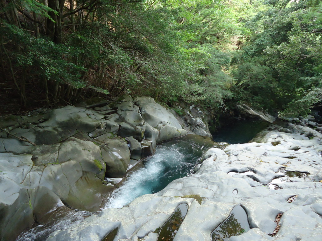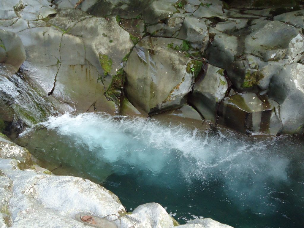 猿田淵には川底に溶岩が現れ、磨き上げられた溶岩の上を滑るように川が流れています。