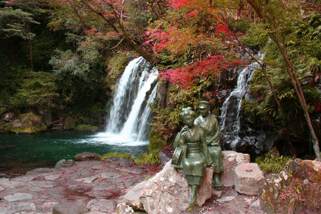 滝の近くには「伊豆の踊り子と私」のブロンズ像があり、人気の記念写真