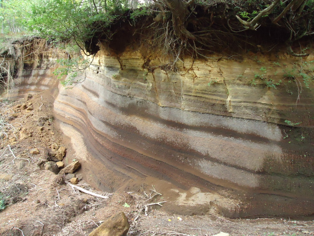 山頂近くの切通しや遊歩道には、降り積もったスコリアが美しい地層を作っています。