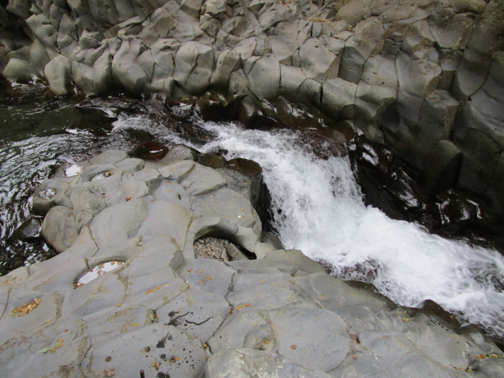 鉢ノ山から流れ下ってきた溶岩の上を流れる佐ヶ野川と溶岩が冷え固まる際にできる柱状節理